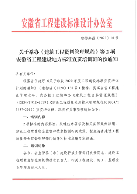 關(guān)于舉辦《建筑工程資料管理規(guī)程》等2項(xiàng)安徽省工程建設(shè)地方標(biāo)準(zhǔn)宣貫培訓(xùn)班的預(yù)通知