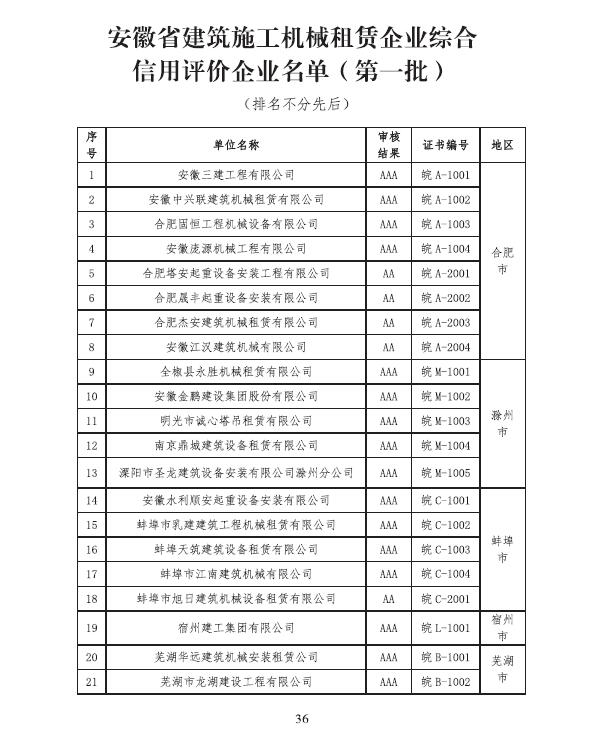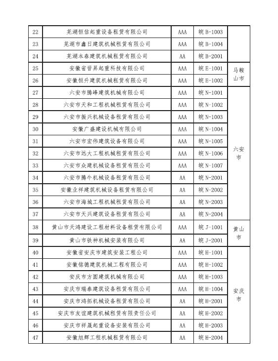 安徽省安裝和機(jī)械設(shè)備協(xié)會(huì)關(guān)于通報(bào)第一批獲得安徽省建筑施工機(jī)械 租賃企業(yè)綜合信用評(píng)價(jià)的企業(yè)名單