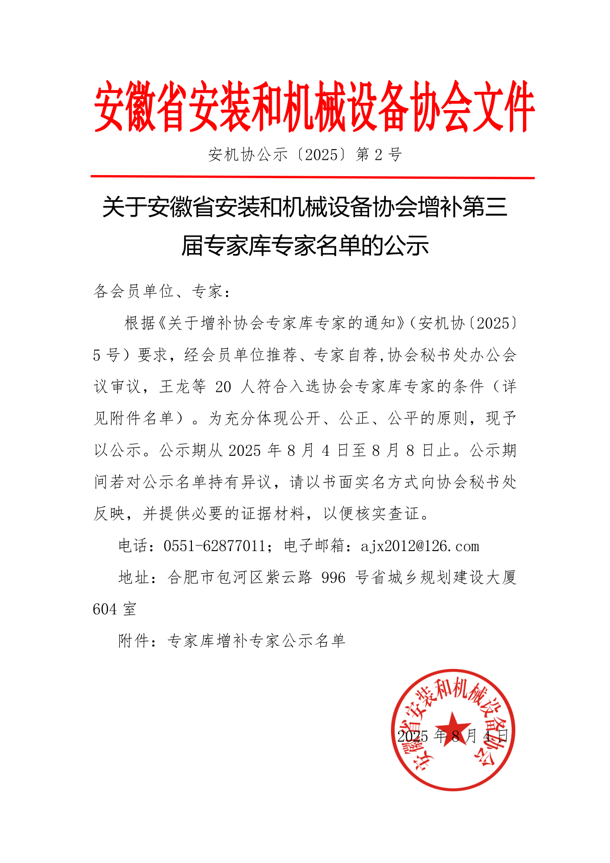 關(guān)于安徽省安裝和機(jī)械設(shè)備協(xié)會(huì)增補(bǔ)第三屆專家?guī)鞂<颐麊蔚墓?/div>