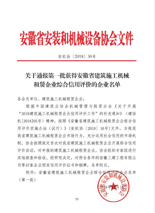 安徽省安裝和機(jī)械設(shè)備協(xié)會(huì)關(guān)于通報(bào)第一批獲得安徽省建筑施工機(jī)械 租賃企業(yè)綜合信用評(píng)價(jià)的企業(yè)名單